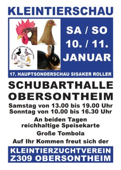 Zwei Tage lang präsentierten die Züchterinnen und Züchter des Kleintierzuchtvereins Obersontheim ihre Tiere. In der Schubarthalle wurden circa 650 Tiere ausgestellt: Puten, Gänse, Enten, Hühner, Wachteln, Tauben und Kaninchen konnten bestaunt werden. In diesem Jahr war auch die Hauptsonderschau der Sisaker Roller der Ausstellung angesiedelt. Sisaker Roller sind eine Taubenrasse, die im 19. Jahrhundert rund um die kroatische Stadt Sisak erzüchtet wurde.